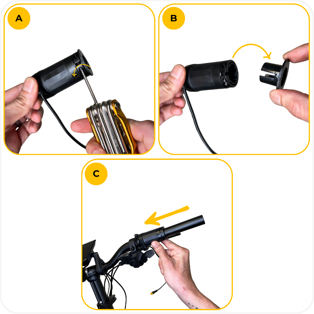 - Use your multitool Allen wrench to loosen the small bolt located on the twist throttle housing.