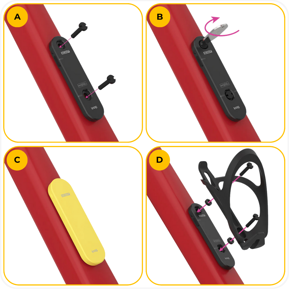 Place the Scout on your bike, aligning the holes with bottle cage screw bosses, then insert the screws.