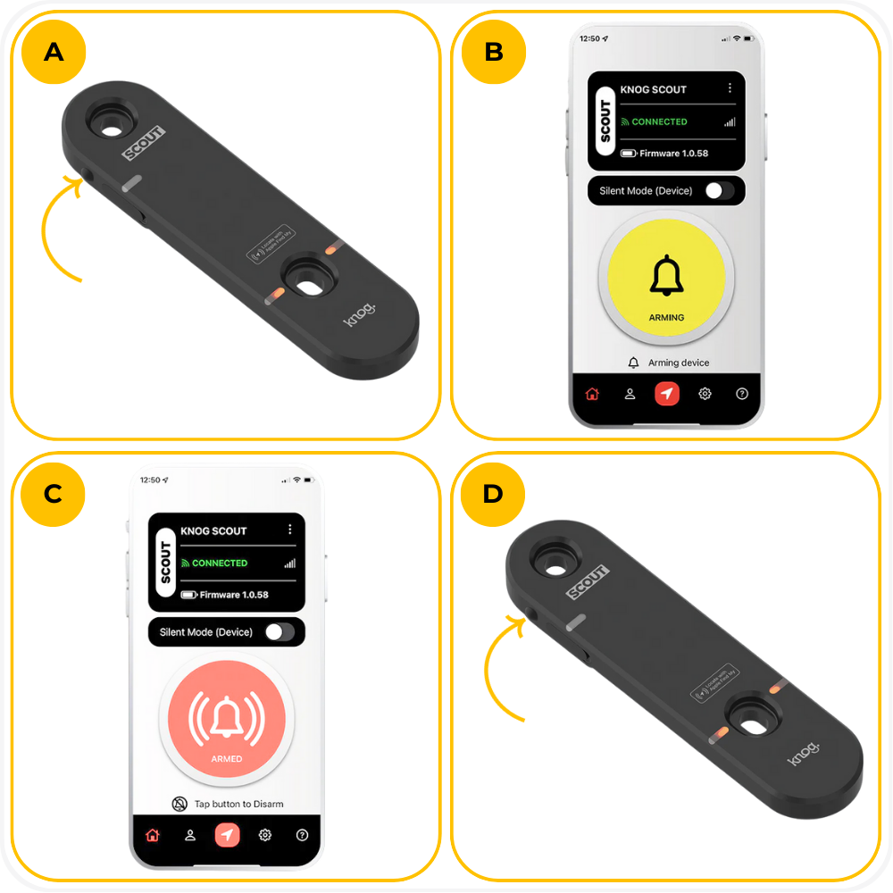 To arm the Scout, make sure the phone is in very close range and the Knog app is active.