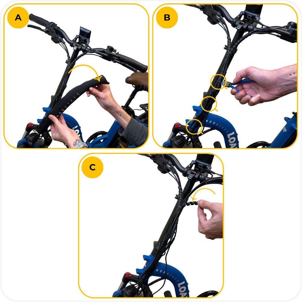Untwist the spiral plastic organizer to expose the cables running down the handlebar.