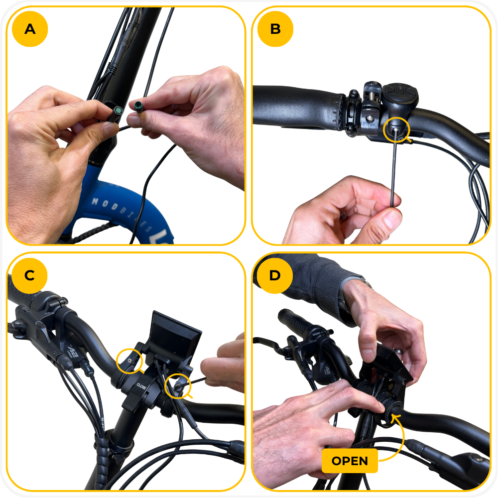 ⚠️ Important Safety & Liability Notice Always ensure your bike is powered off and the battery is removed before connecting or disconnecting any display cables. Avoid twisting connectors or overtightening bolts, as this can damage the display or handlebar clamps. If you’re unsure or uncomfortable performing this replacement, please contact a qualified MOD BIKES technician or authorized service provider. MOD BIKES is not liable for damage or injury caused by improper installation or failure to follow these instructions.