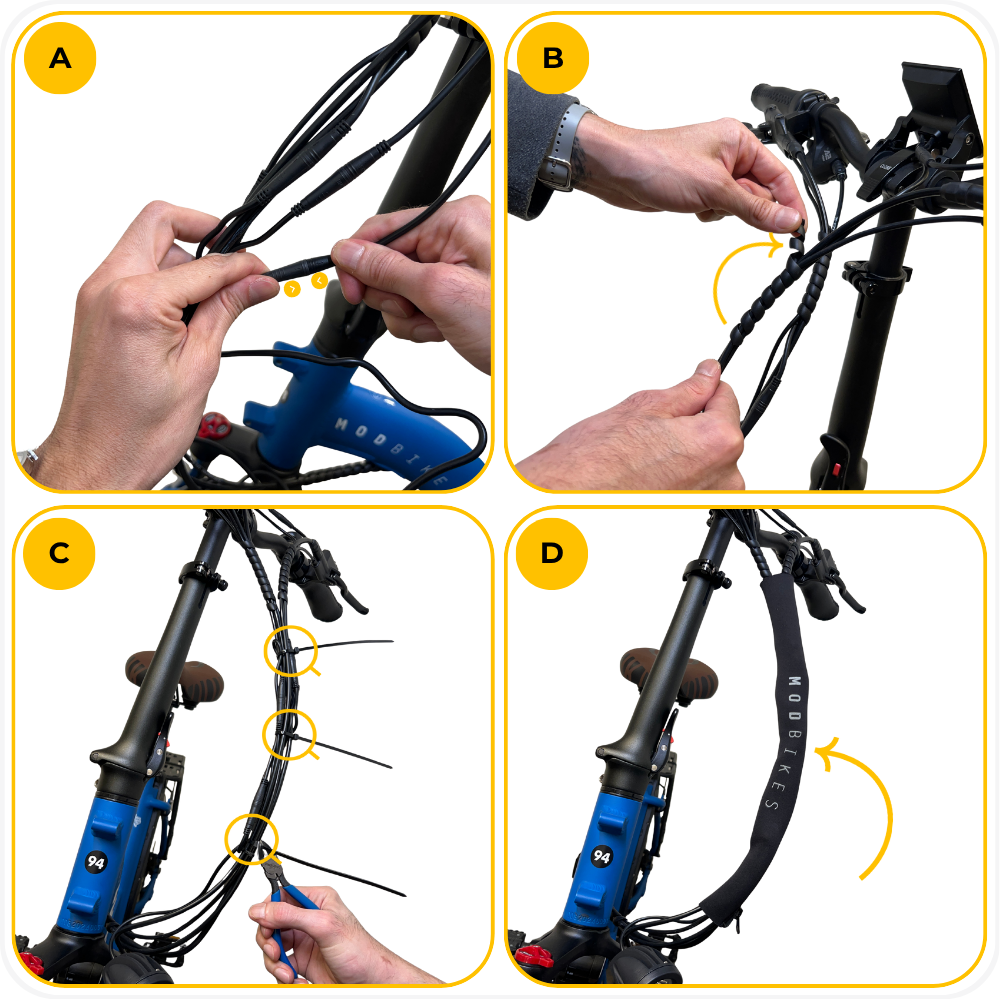 Twist the spiral plastic organizer to cover the cables running down the handlebar.