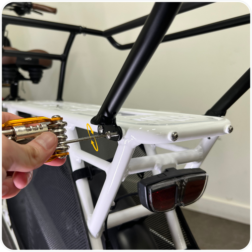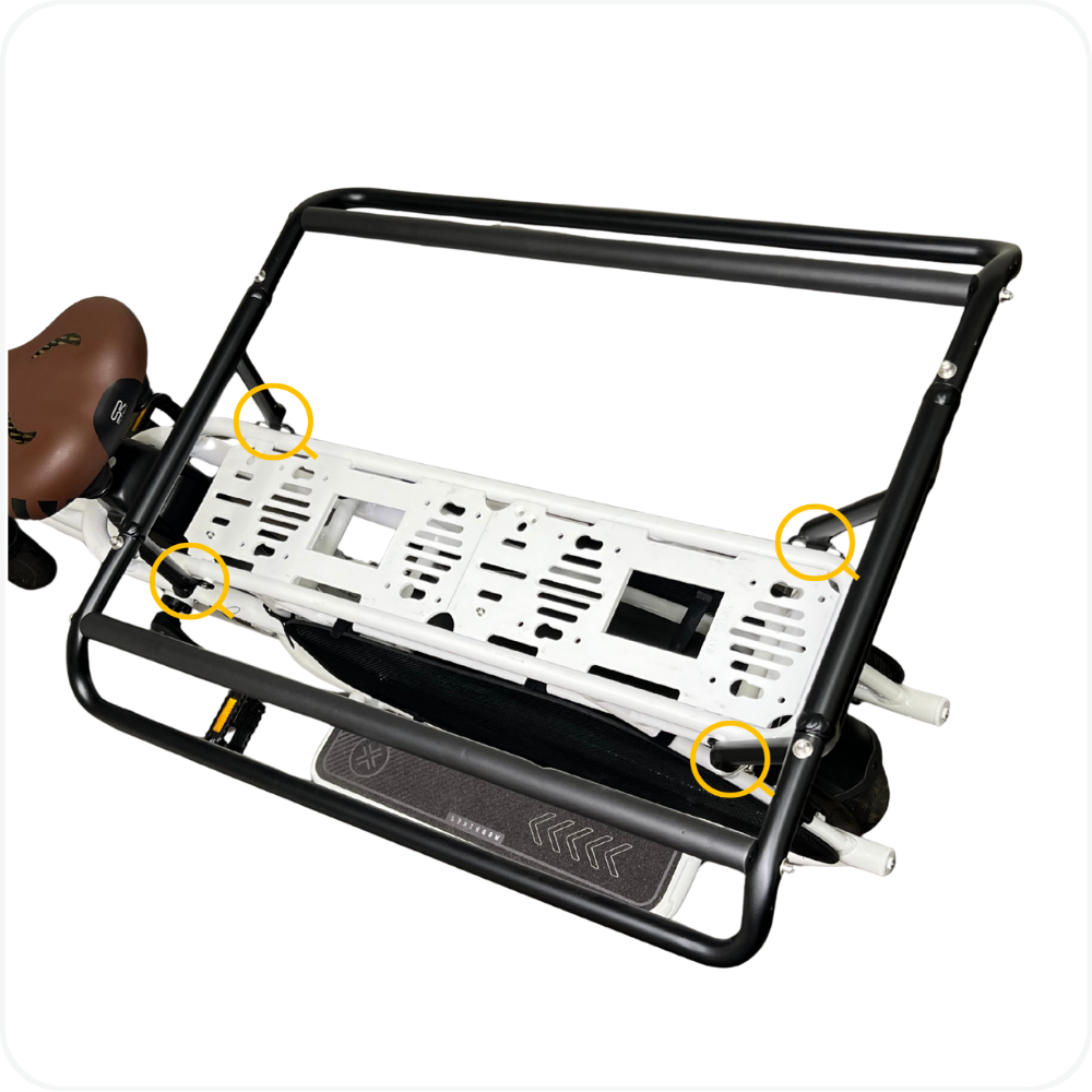 Using the 3mm Allen wrench included in your bike tool kit, remove the screws already installed in the rear rack, and reuse those same screws to attach the handrail brackets. There are 8 screws total, with 2 screws per corner. Tighten all screws until fully secure.
