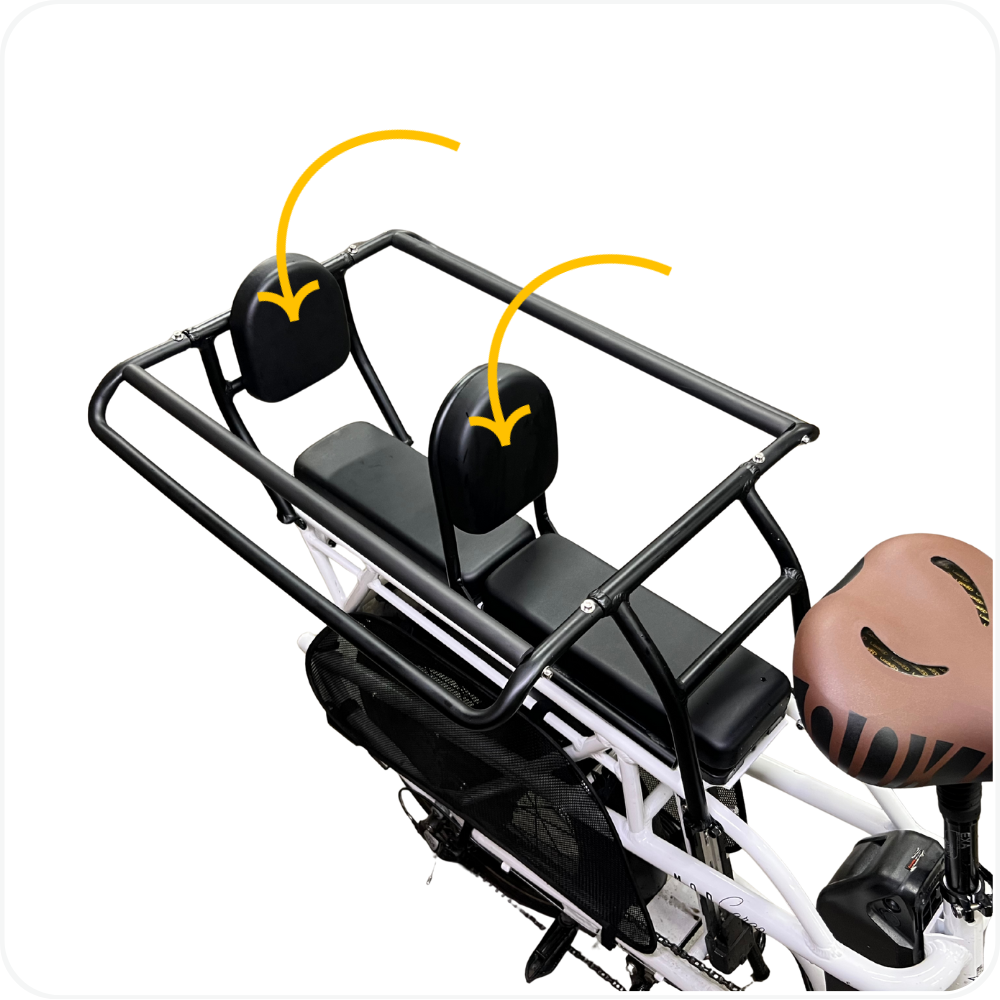 Snap the bench seats onto the rear rack.. Gently pull up on each bench to confirm it is fully secured before riding.