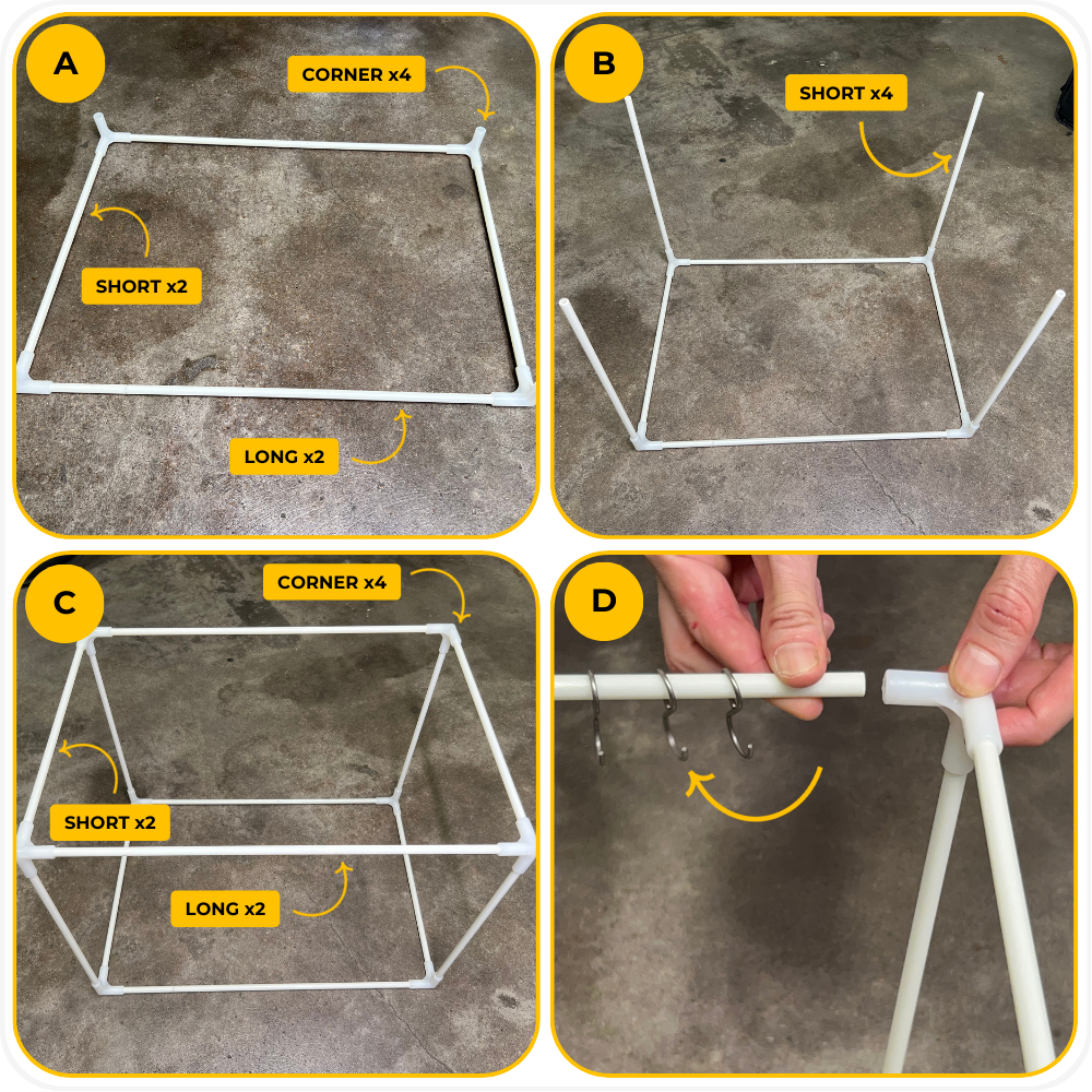 Assemble the top rectangle using 2 long tubes, 2 short tubes, and 4 corner connectors. Lower the top frame onto the vertical posts and press down until fully seated.