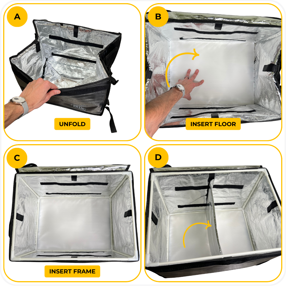 Fully unfold the insulated delivery bag and open it wide. Make sure all sides and corners are fully expanded.