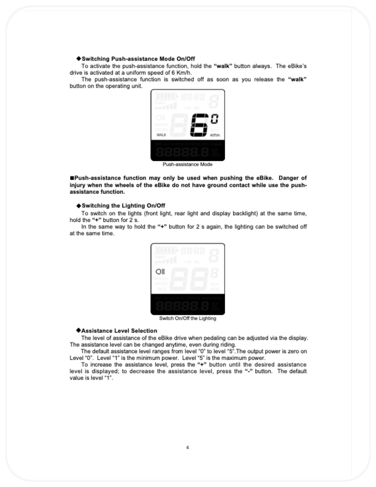 Assist Level 0 disables motor assistance while keeping the display active. - Can I reset the display to factory settings?