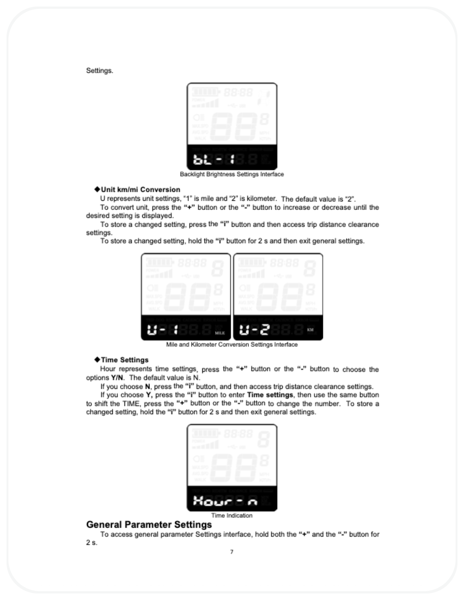 ⚠️ Important Safety & Liability Notice These instructions are provided as a general guide for MOD BIKES products. Always ensure the bike is stationary before entering or adjusting display settings. Do not modify advanced system parameters unless you fully understand their function. Incorrect configuration may result in reduced performance, unexpected behavior, electrical damage, or safety hazards. Do not disconnect the display or wiring while the battery is powered on. If you are not confident performing these adjustments, please seek assistance from a qualified MOD BIKES technician. MOD BIKES shall not be held liable for injury, damage, or loss caused by improper use, configuration, or failure to follow these guidelines. Local laws and regulations may apply.