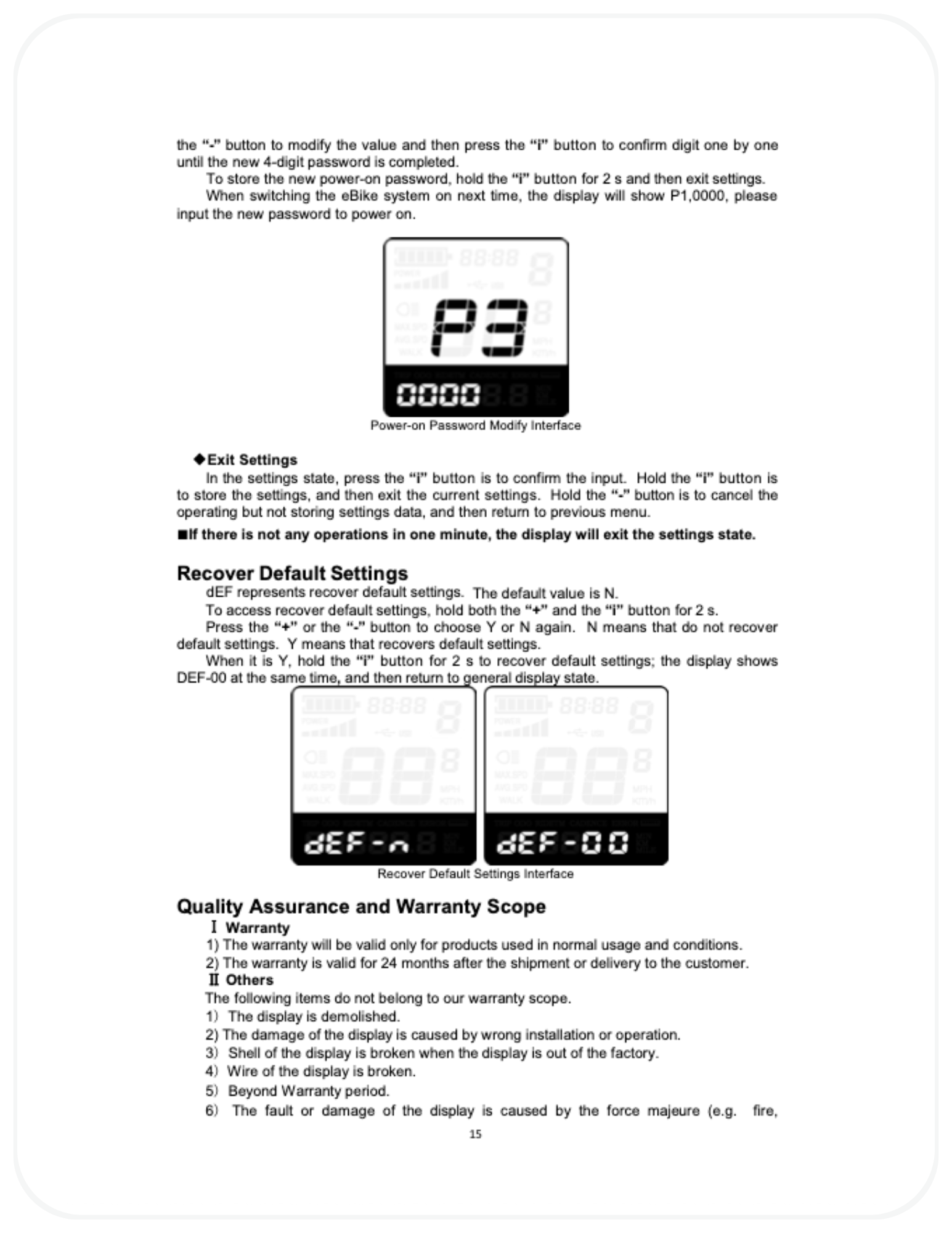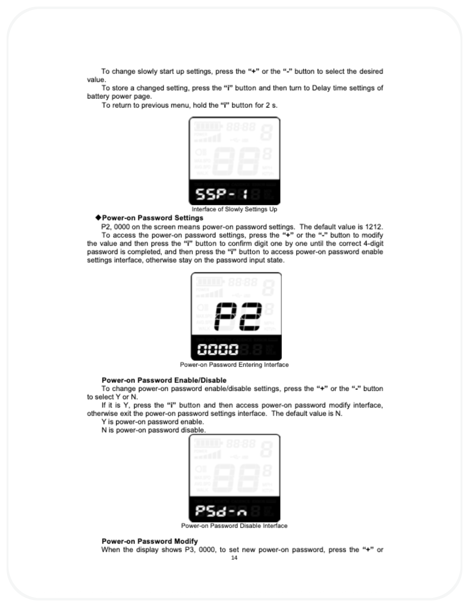 The display uses voltage-based readings, which can fluctuate under load, especially during acceleration or climbing hills. - I forgot my power-on password. What should I do?